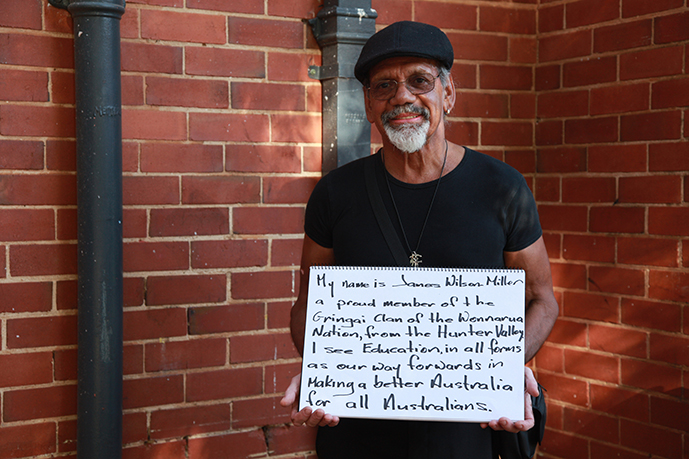 “My name is James Wilson-Miller, a proud member of the Gringai Clan of Wonnarua Nation, from the Hunter Valley. I see education in all forms as our way forward in making a better Australia for all Australians.”